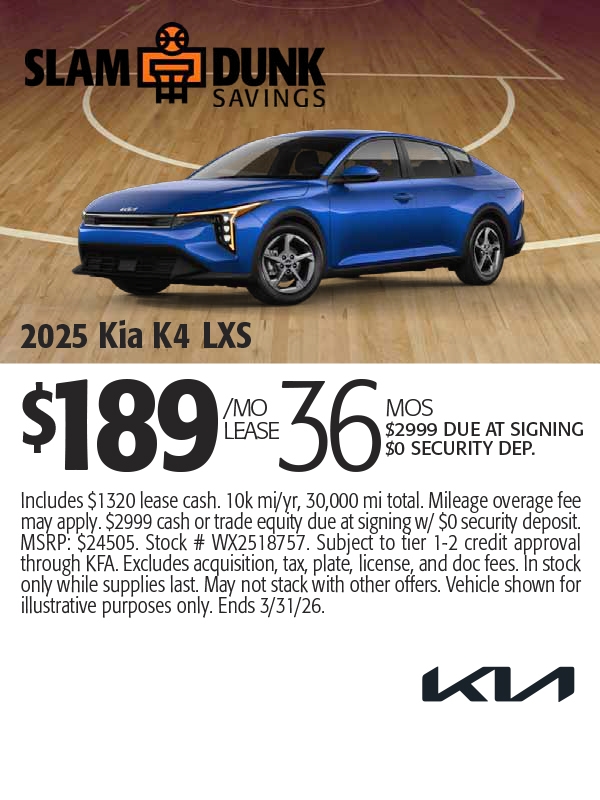 Includes $1920 lease cash. 10k mi/yr, 30,000 mi total. Mileage overage fee may apply. $2999 cash or trade equity due at signing w/ $0 security deposit. MSRP: $24375. Stock # WX2518242. Subject to tier 1-2 credit approval through KFA. Excludes acquisition, tax, plate, license, and doc fees. In stock only while supplies last. May not stack with other offers. Vehicle shown for illustrative purposes only. Ends 3/2/26.