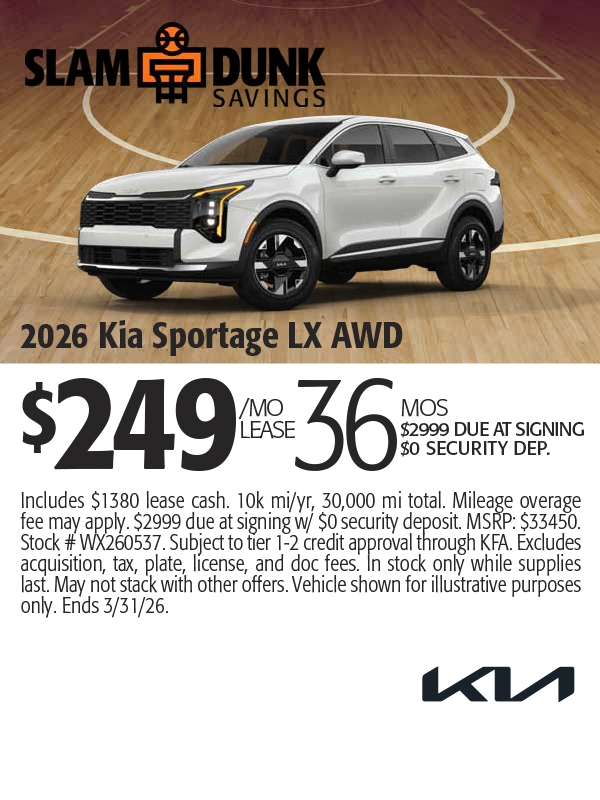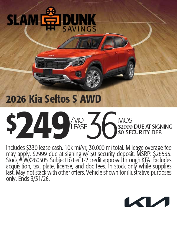 Includes $1640 lease cash. 10k mi/yr, 30,000 mi total. Mileage overage fee may apply. $2999 cash or trade equity due at signing w/ $0 security deposit. MSRP: $39030. Stock # WX260359. Subject to tier 1-2 credit approval through KFA. Excludes acquisition, tax, plate, license, and doc fees. In stock only while supplies last. May not stack with other offers. Vehicle shown for illustrative purposes only. Ends 3/2/26.