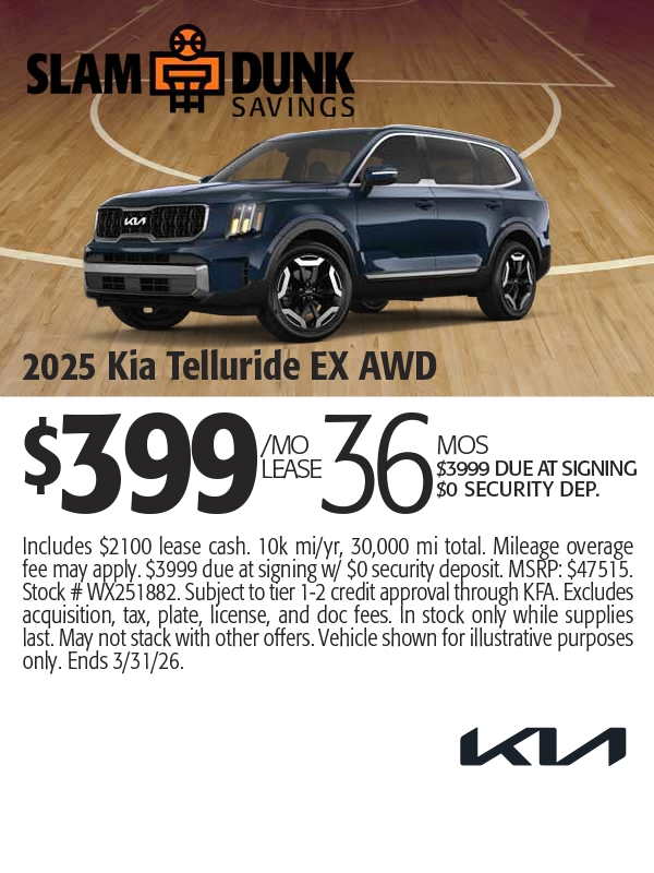 Includes $2200 lease cash. 10k mi/yr, 30,000 mi total. Mileage overage fee may apply. $3999 due at signing w/ $0 security deposit. MSRP: $43335. Stock # WX251572. Subject to tier 1-2 credit approval through KFA. Excludes acquisition, tax, plate, license, and doc fees. In stock only while supplies last. May not stack with other offers. Vehicle shown for illustrative purposes only. Ends 3/2/26.