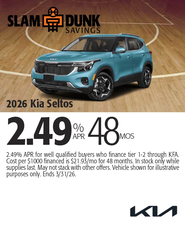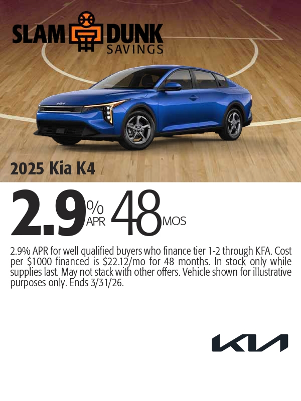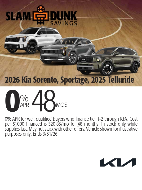 0% APR for well qualified buyers who finance tier 1-2 through KFA. Cost per $1000 financed is $20.83/mo for 48 months. In stock only while supplies last. May not stack with other offers. Vehicle shown for illustrative purposes only. Ends 3/2/26.